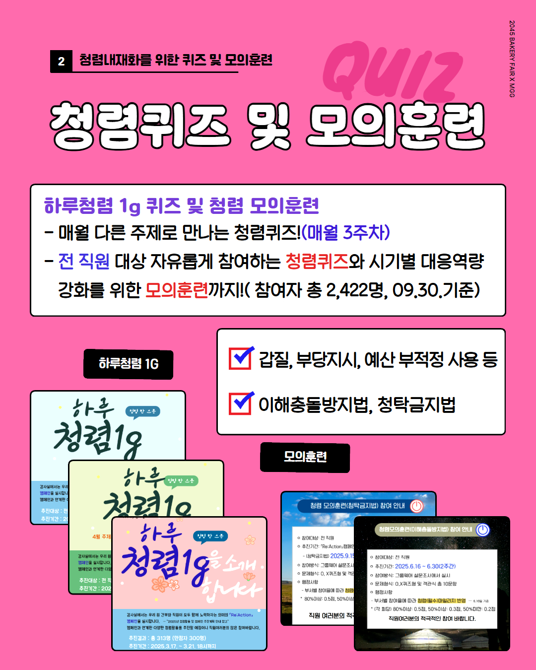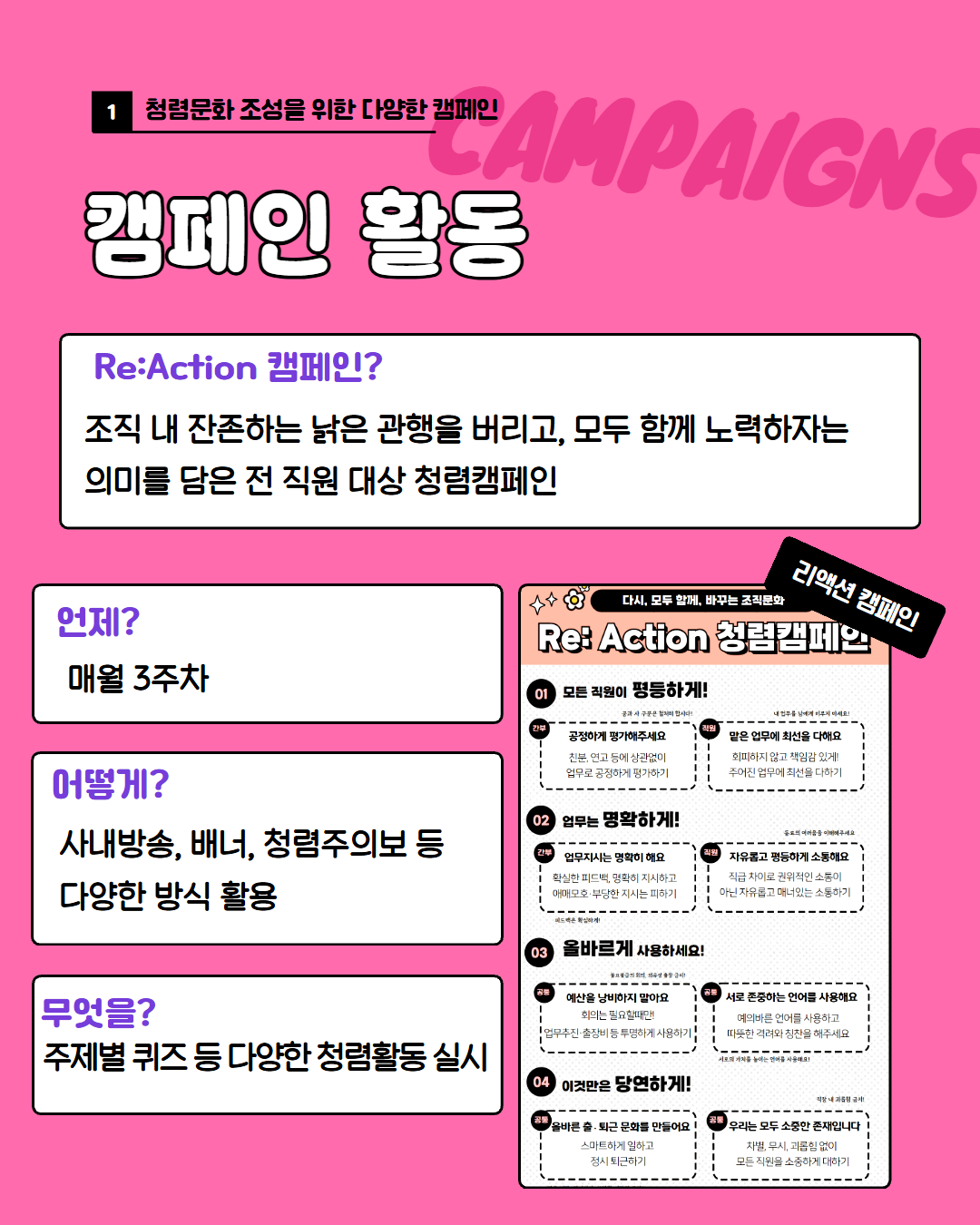 2025년 Re:Action 캠페인 및 청렴 퀴즈 작성자 이예진 등록일 2025-10-20 조회수 347 우리 원의 2025년 반부패·청렴캠페인 활동을 공유합니다. 이전글 감사원 국제교육과정 연수생 기관방문 2025-09-18 다음글 2025년 기관장과 함께하는 4대비위 근절 캠페인 2025-10-20 목록 만족도 평가이 페이지에서 제공하는 정보에 얼마나 만족하십니까? 매우만족 만족 보통 불만족 매우불만족 평가