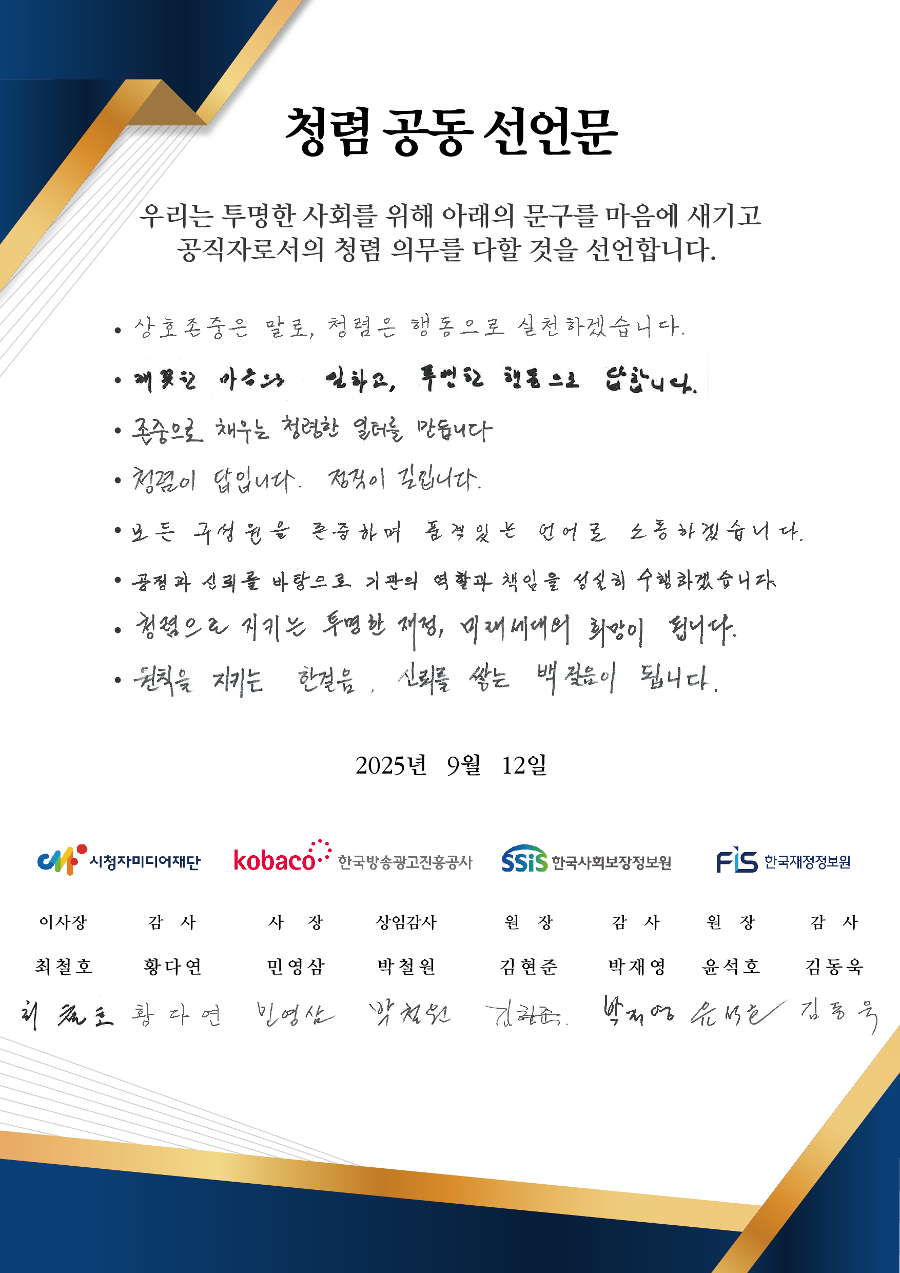 [청렴파트너스 공동선언문] 투명하고 공정한 사회 실현을 위한 약속 작성자 이예진 등록일 2025-09-15 조회수 302 청렴은 우리 사회의 지속가능한 발전과 신뢰의 기반입니다. 우리 기관은 공직사회의 청렴성을 제고하고 공직자 윤리의식 전파를 위해 청렴파트너스*와 함께 다음과 같이 공동 선언합니다. * 청렴파트너스 : 권익위 청렴도 평가를 받는 서울 소재 공공기관 협의체 이전글 2025년 한국사회보장정보원 청렴서한문 안내 2025-07-30 다음글 감사원 국제교육과정 연수생 기관방문 2025-09-18 목록 만족도 평가이 페이지에서 제공하는 정보에 얼마나 만족하십니까? 매우만족 만족 보통 불만족 매우불만족 평가