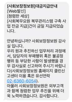 먼저 한국사회보장정보원과 계약을 맺은 협력사를 대상으로, 감사실에서 직접 전화를 걸어 계약체결 과정에서 기관 담당자의 불합리한 계약 조건 요구나 금품 제공 요구 등 부패행위가 있었는지 확인하게 됩니다. 2021년에는 8월까지 한국사회보장정보원과 계약을 체결한 사업 담당자를 대상으로 총 303건의 사업에 대한 청렴 CALL 서비스가 실시되었는데요. 사업추진 과정에서 부패나 불공정 행위에 대해 확인하고, 관련 건의사항을 청취하는 등 협력사의 입장에서 사업추진 과정을 살펴보는 기회가 되고 있다고 합니다. 이러한 전화와 더불어 협력사는 계약대금 지급 안내 문자를 받게 되는데, 이와 함께 부패 상황 발생 시 신고할 수 있는 신고채널 경로와 전화번호를 다시 한 번 안내받게 됩니다.