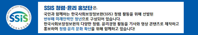 이번 기사를 준비하면서 저 역시 청렴문화 정착과 확산, 투명하고 공정한 사업운영을 위한 한국사회보장정보원의 다양한 노력들을 느낄 수 있었습니다. 무엇보다 정보원의 임직원이 청렴한 업무추진에 대해 개인의 의무감과 책임감을 가지고 있는 것은 물론, 여러 제도를 통해 청렴한 기관 만들기를 합심하여 노력하고 있다는 것을 알 수 있었는데요. 이러한 노력을 바탕으로 외부 기관은 물론 정보원의 고객인 국민에게 청렴한 공공기관으로의 신뢰를 제고하고, 협력사와 함께 더욱 발전하는 한국사회보장정보원이 될 수 있기를 기대해봅니다.
