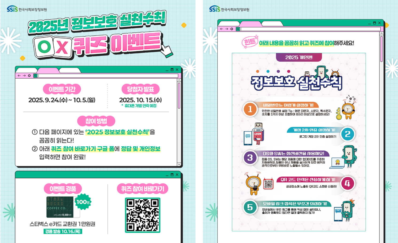한국사회보장정보원은 오는 9월 30일 개인정보 보호의 날을 맞아 국민의 개인정보 보호 문화 확산을 위해 9월 24일부터 10월 5일까지 ‘2025년 대국민 개인정보 보호 퀴즈대회’를 개최한다.