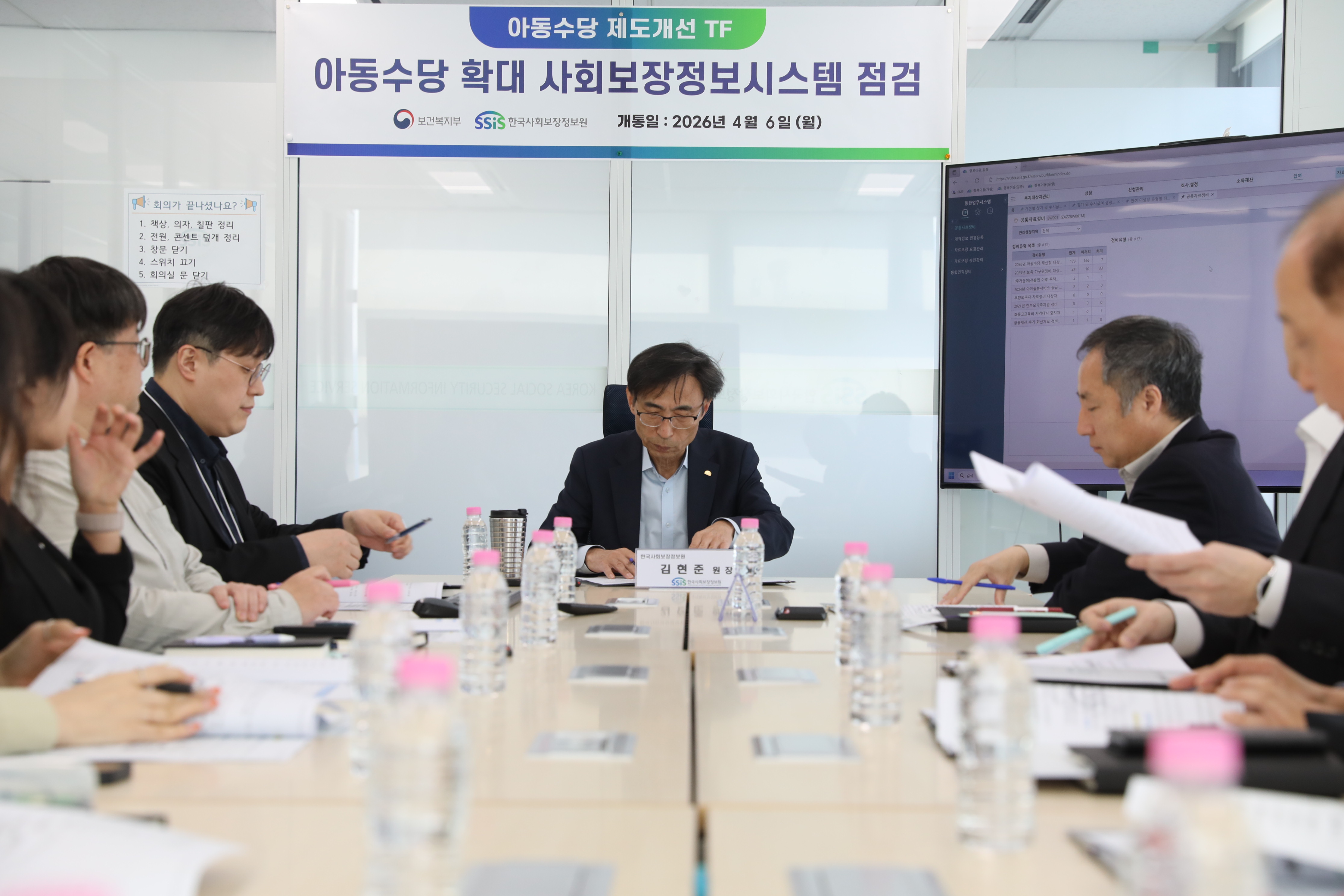 [사진 설명: 김현준 한국사회보장정보원장(사진 가운데)이 아동수당 제도개선 TF 회의에서 사회보장정보시스템 준비 상황을 점검하고 있다. / 한국사회보장정보원]