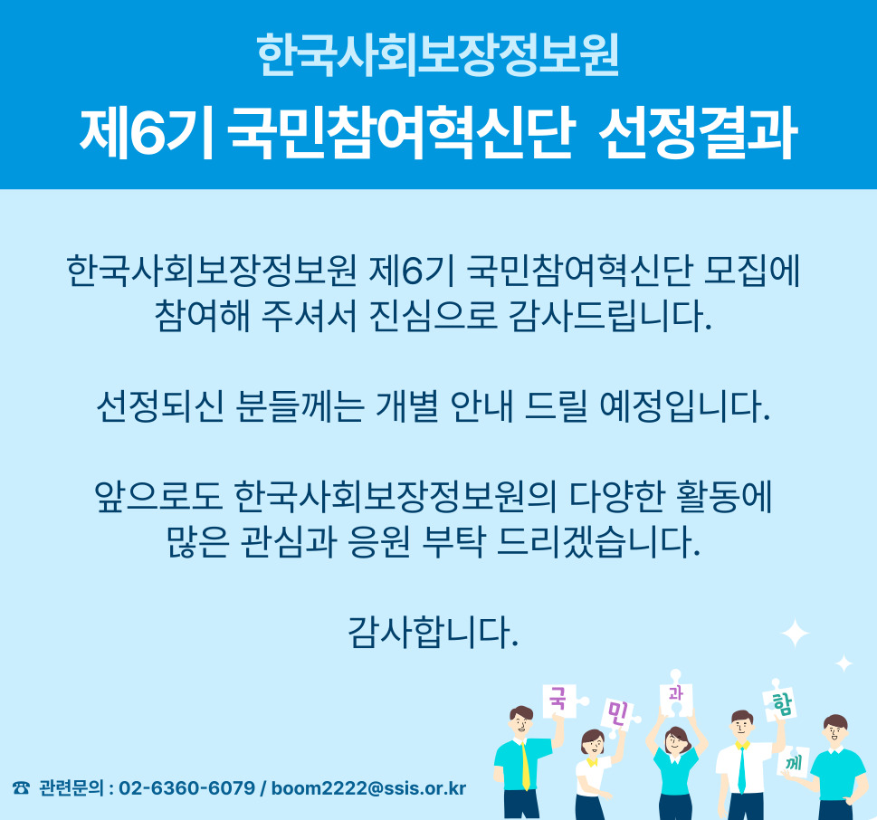 제6기 국민참여혁신단 선정 결과 작성자 최부미 등록일 2025-10-21 조회수 139 이전글 복지로 복지지갑 서비스 수요조사 실시 안내 2025-10-16 다음글 이전 글이 없습니다. 목록 만족도 평가이 페이지에서 제공하는 정보에 얼마나 만족하십니까? 매우만족 만족 보통 불만족 매우불만족 평가