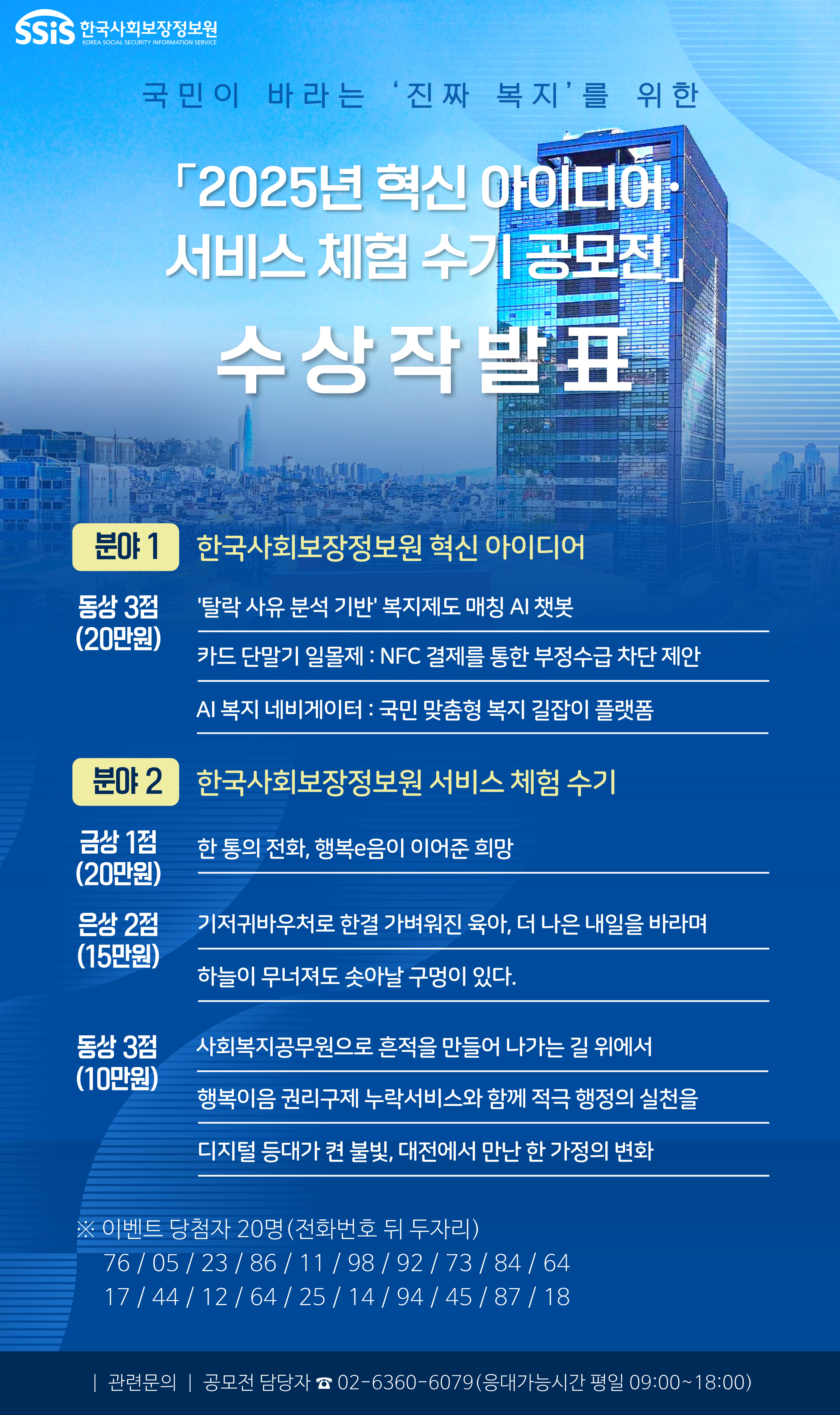 2025년 혁신 아이디어 / 서비스 체험 수기 공모전 수상작 발표 작성자 관리자 등록일 2025-11-26 조회수 83 이전글 국가장학금 신청자와 함께하는 복지멤버십 신규 가입 이벤트 2025-11-24 다음글 이전 글이 없습니다. 목록 만족도 평가이 페이지에서 제공하는 정보에 얼마나 만족하십니까? 매우만족 만족 보통 불만족 매우불만족 평가