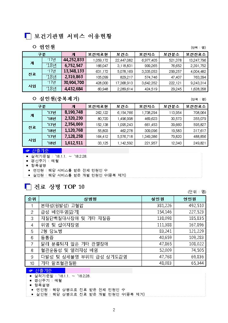 사회보장통계는 공공데이터포털에서도 검색하고 활용 하실 수 있습니다. 공공데이터포털 바로가기 지역보건의료정보시스템 주요업무 통계(2018.2.28 기준) 작성자 이수빈 등록일 2018-03-19 조회수 7277 이전글 지역보건의료정보시스템 주요업무 통계(2018.1.31 기준) 2018-03-19 다음글 지역보건의료정보시스템 주요업무 통계(2018.3.31 기준) 2018-04-11 목록 만족도 평가이 페이지에서 제공하는 정보에 얼마나 만족하십니까? 매우만족 만족 보통 불만족 매우불만족 평가