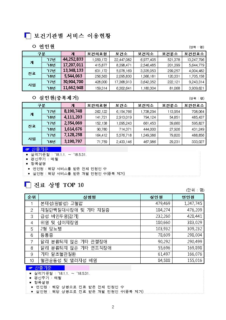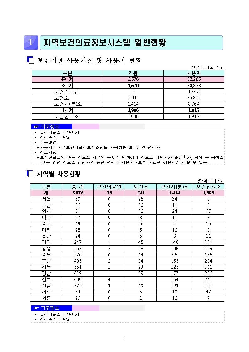 사회보장통계는 공공데이터포털에서도 검색하고 활용 하실 수 있습니다. 공공데이터포털 바로가기 지역보건의료정보시스템 주요업무 통계(2018.5.31 기준) 작성자 이수빈 등록일 2018-06-07 조회수 7097 첨부파일 지역보건의료정보시스템 주요업무 통계(2018.5.31 기준).pdf 이전글 지역보건의료정보시스템 주요업무 통계(2018.4.30 기준) 2018-05-11 다음글 2018년 5월 보육사업통계 2018-06-11 목록 만족도 평가이 페이지에서 제공하는 정보에 얼마나 만족하십니까? 매우만족 만족 보통 불만족 매우불만족 평가