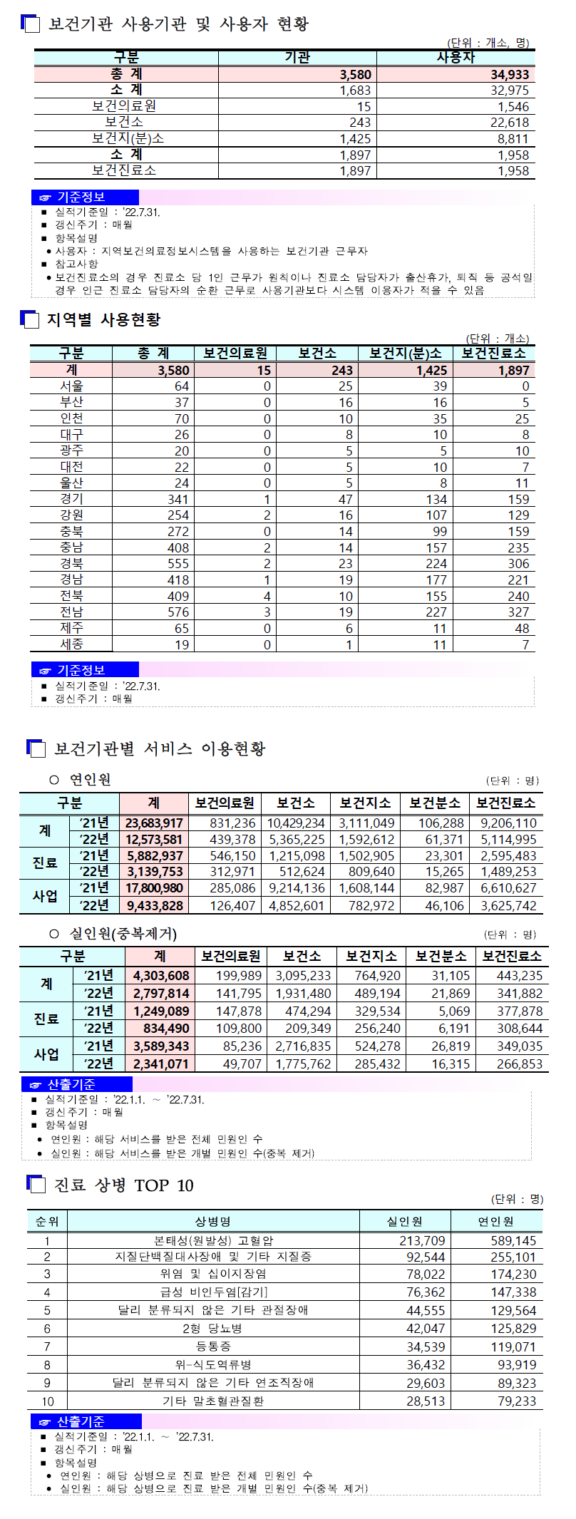 사회보장통계는 공공데이터포털에서도 검색하고 활용 하실 수 있습니다. 공공데이터포털 바로가기 (수정후)지역보건의료정보시스템 주요업무 통계(2022.7.31. 기준) 작성자 보건의료정보부 등록일 2022-08-08 조회수 1962 첨부파일 지역보건의료정보시스템 주요업무 통계(2022.7.31.기준).pdf 이전글 (수정전)지역보건의료정보시스템 주요업무 통계(2022.7.31. 기준) 2022-08-05 다음글 (수정전)지역보건의료정보시스템 주요업무 통계(2022.8.31. 기준) 2022-09-07 목록 만족도 평가이 페이지에서 제공하는 정보에 얼마나 만족하십니까? 매우만족 만족 보통 불만족 매우불만족 평가